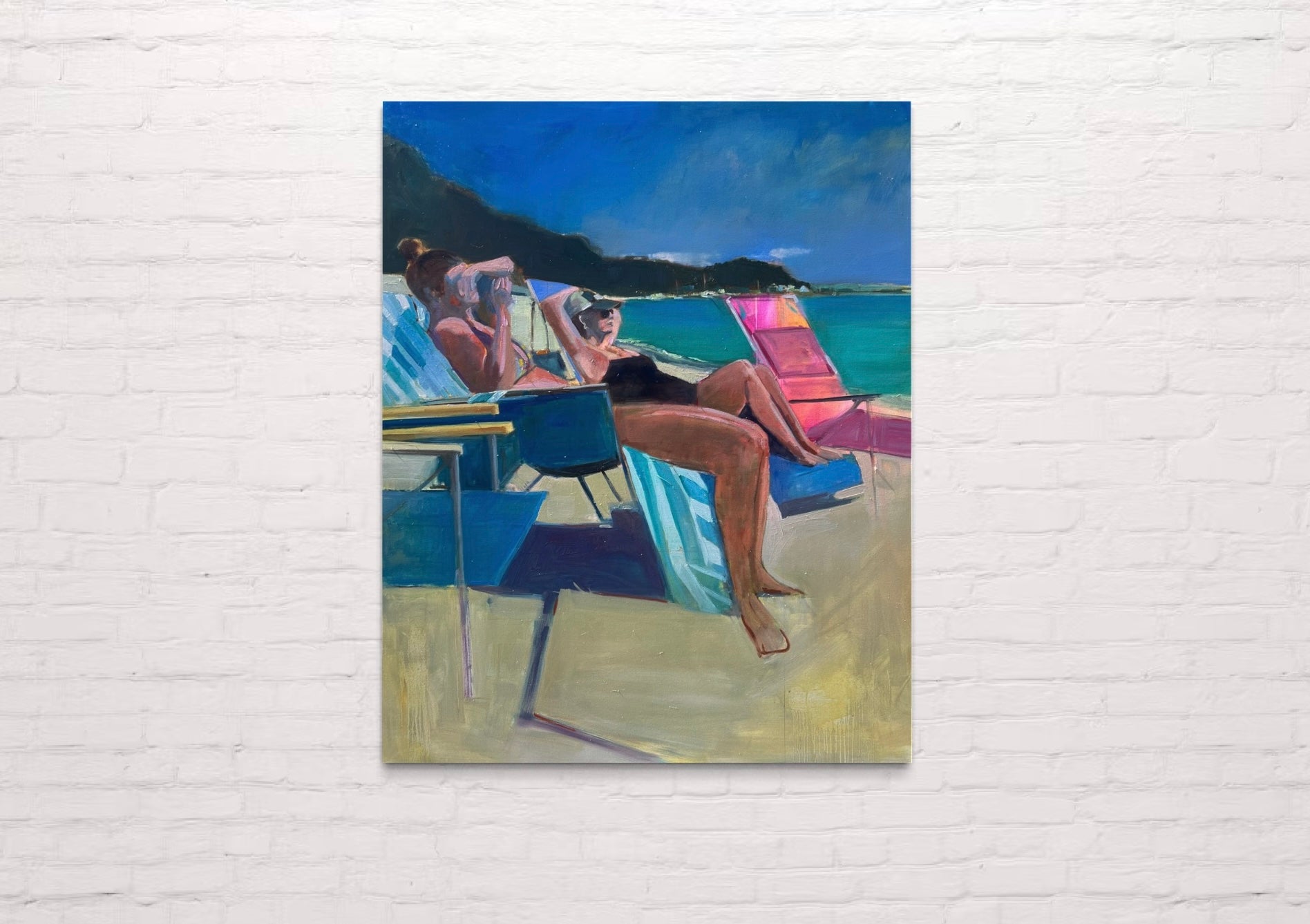 Two women relaxing on colorful beach chairs by the water. One sips a drink, while the other lounges in the sun. The bright sky, turquoise water, and distant hills create a calm, sunny atmosphere. The artist uses loose, expressive brushstrokes and bold colors to capture the warmth and tranquility of a carefree summer day.