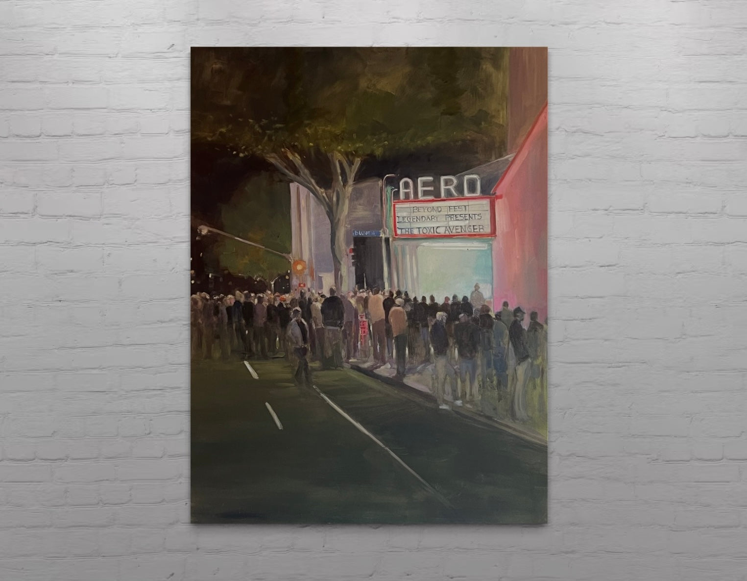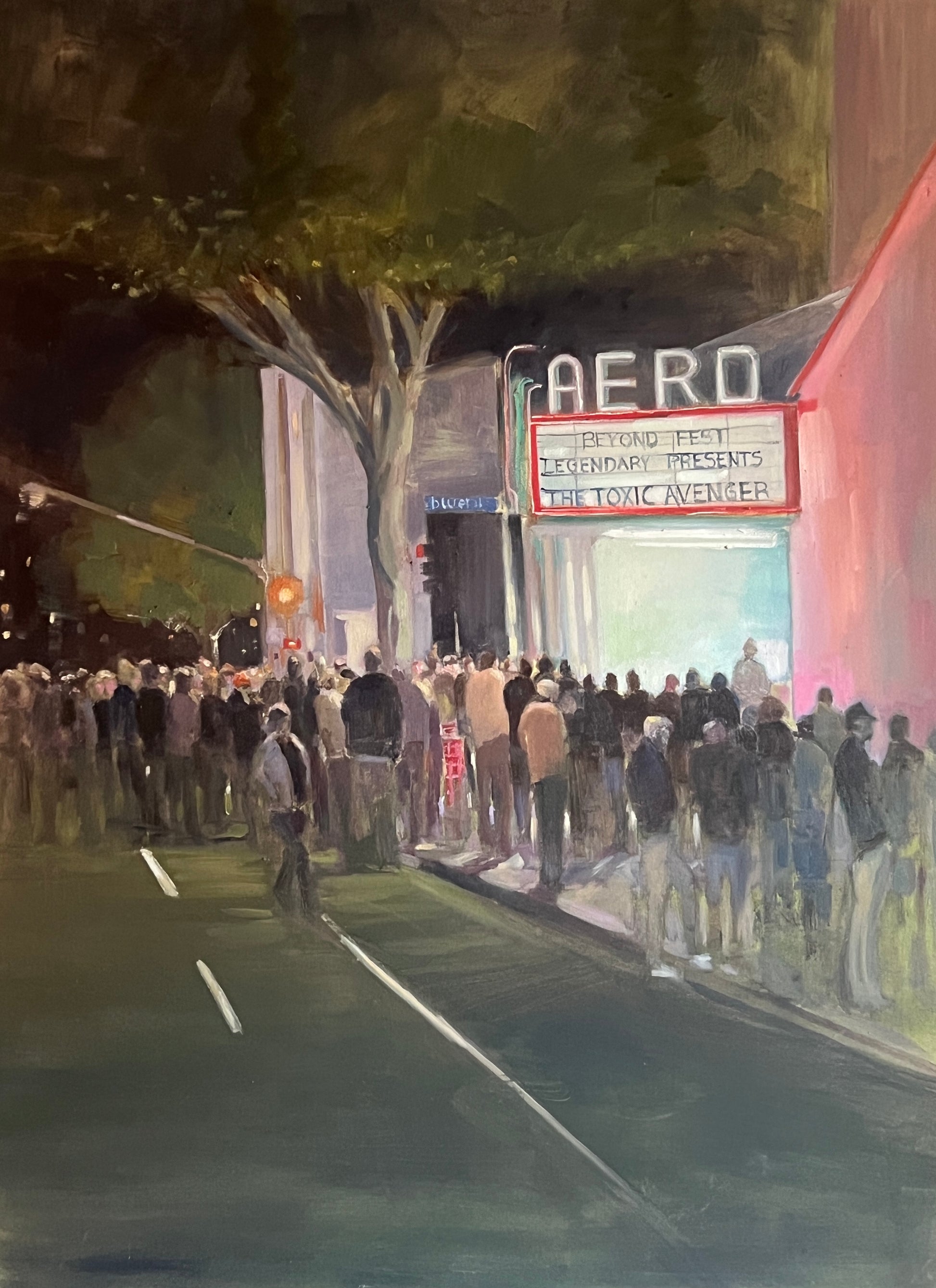 This atmospheric painting captures a lively nighttime scene outside the iconic Aero Theatre, where a large crowd has gathered for a special screening of The Toxic Avenger at Beyond Fest. The artist masterfully blends impressionistic brushwork with rich, moody colors, evoking the energy of a film-loving community.