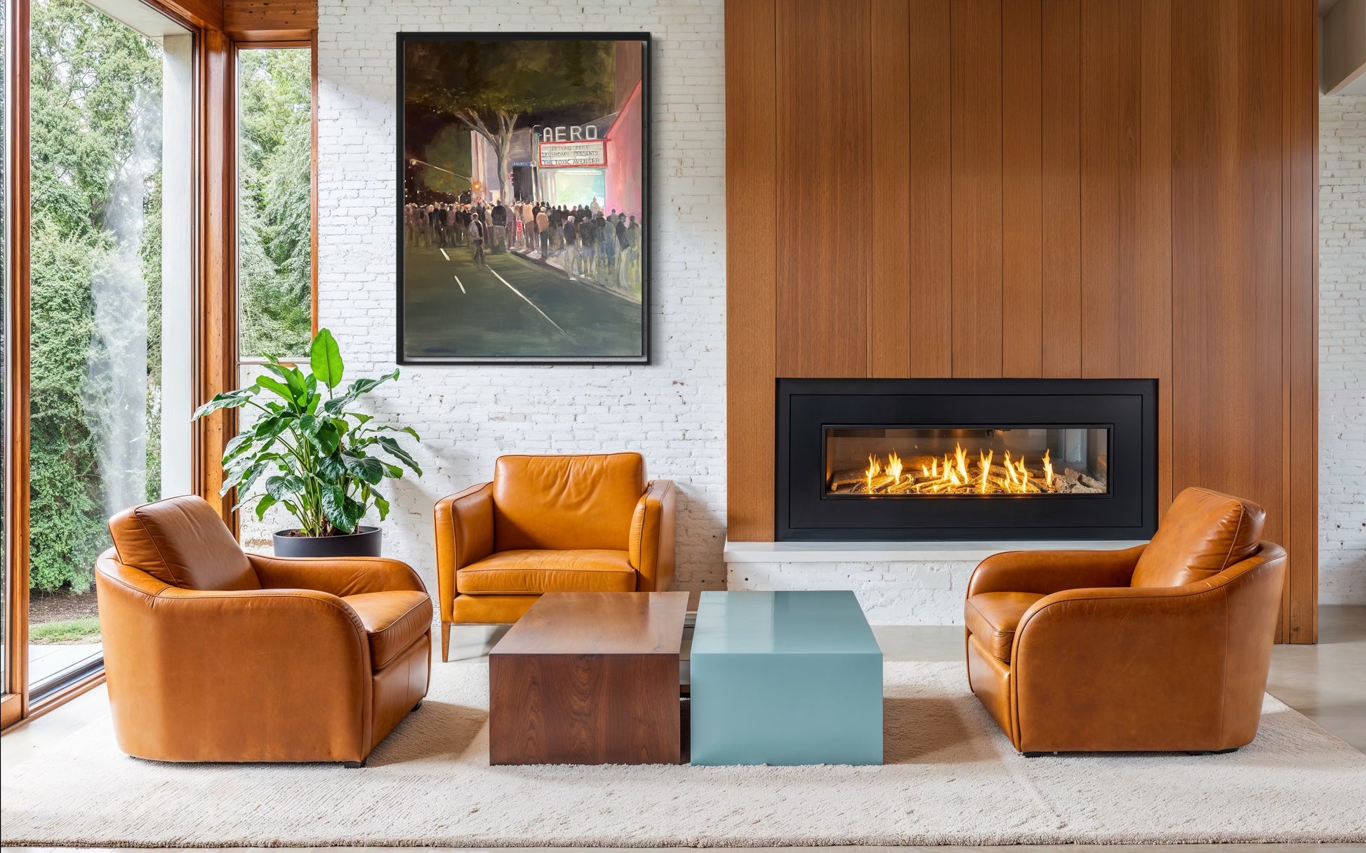 The glowing marquee, neon reflections, and soft streetlights contrast beautifully with the darkened cityscape, creating a cinematic quality that immerses the viewer in the moment. The loose, expressive figures add to the sense of movement and anticipation, making this piece a perfect acquisition for cinephiles, urban art collectors, or anyone drawn to evocative city scenes.