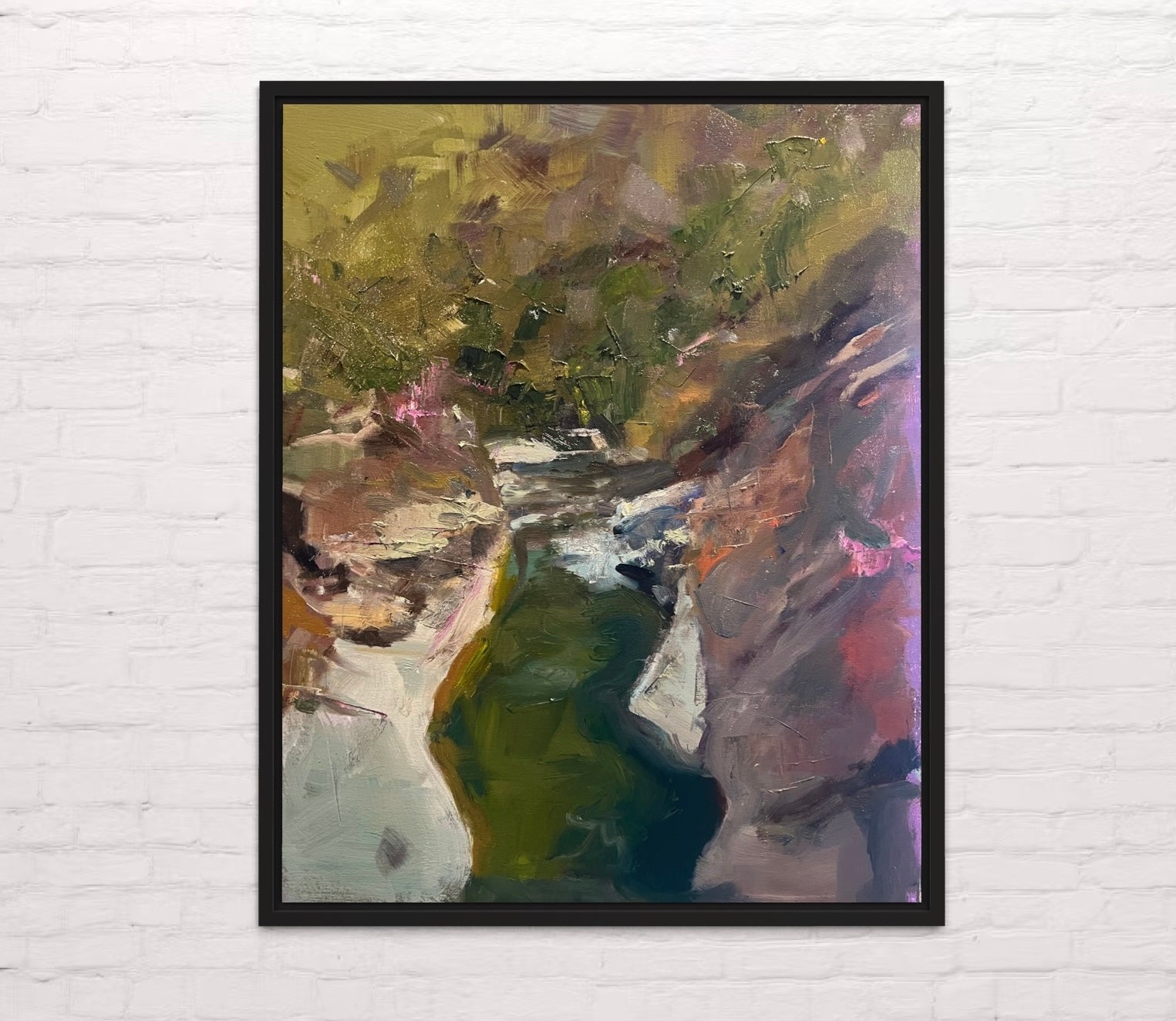 This stunning oil painting captures the raw beauty of a secluded canyon pool, inviting the viewer into a tranquil and immersive natural scene. Rich, expressive brushstrokes bring the rocky cliffs and lush foliage to life, blending earthy tones with subtle pops of color that hint at the play of light on the landscape.