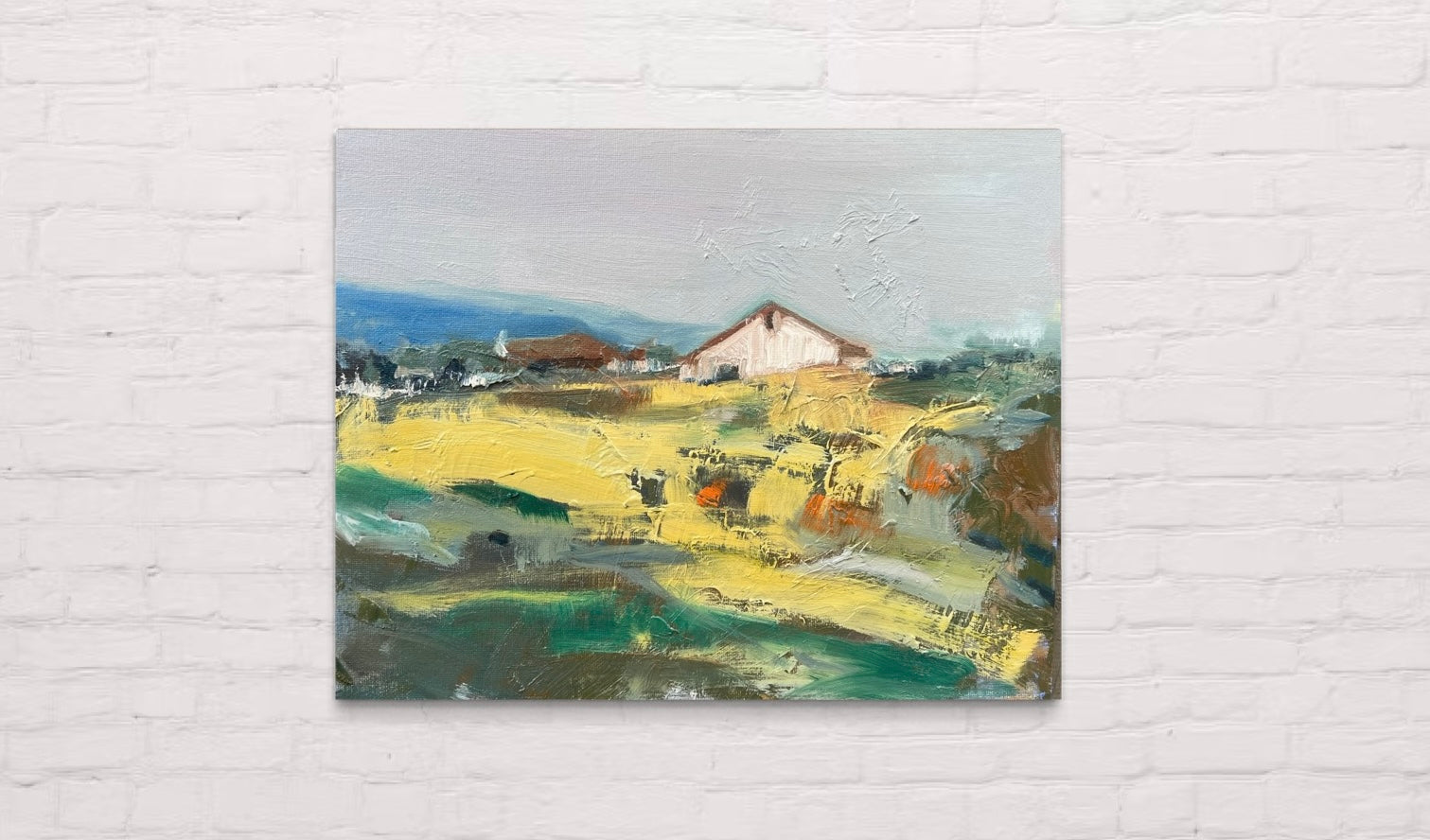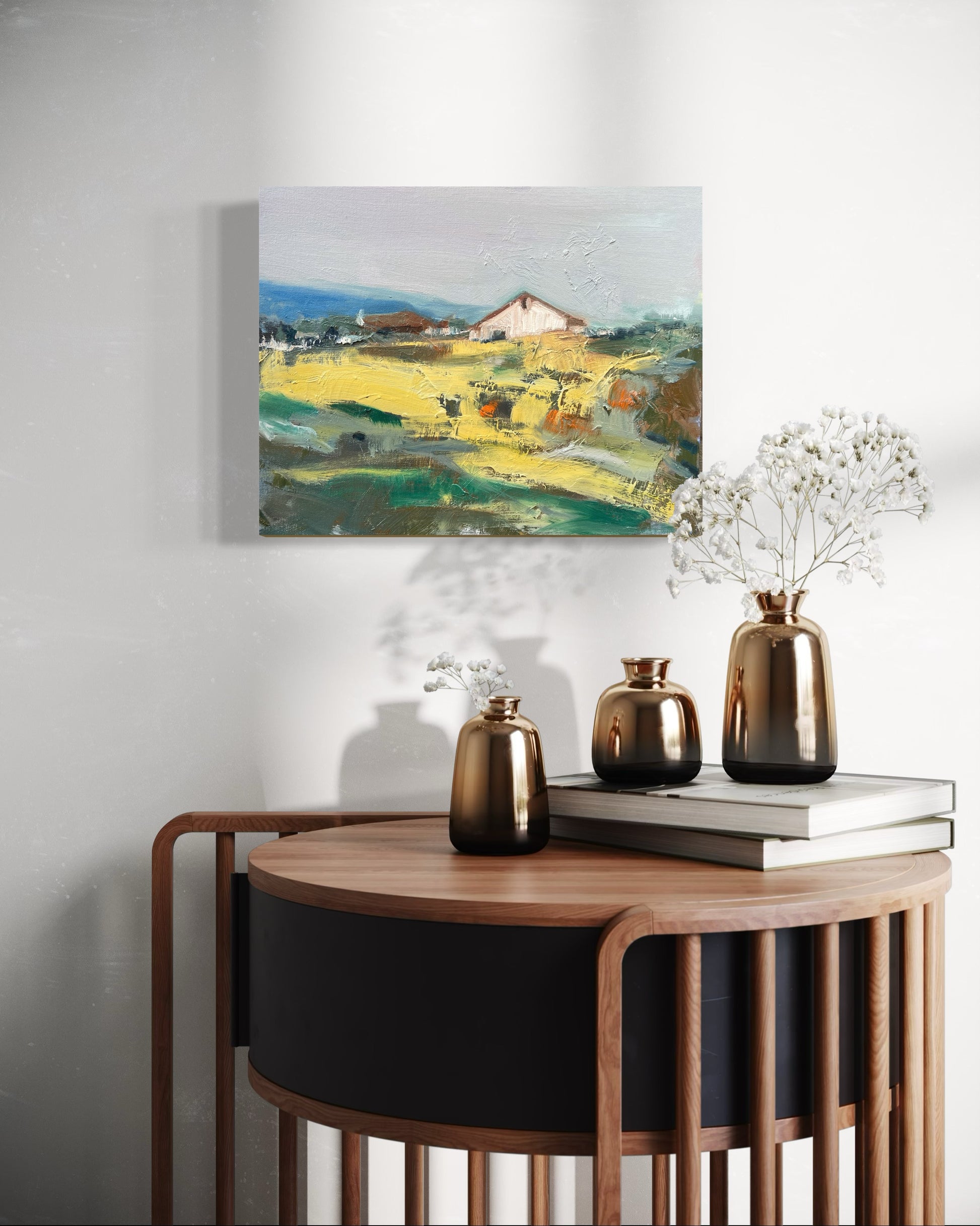 This painting depicts a serene rural scene with a white barn and red roof set against a soft blue horizon and overcast sky. Vibrant yellow fields with touches of green and orange fill the foreground, suggesting blooming wildflowers. The artist’s loose, expressive brushstrokes and textured layers emphasize mood and atmosphere, capturing the essence of a peaceful countryside.