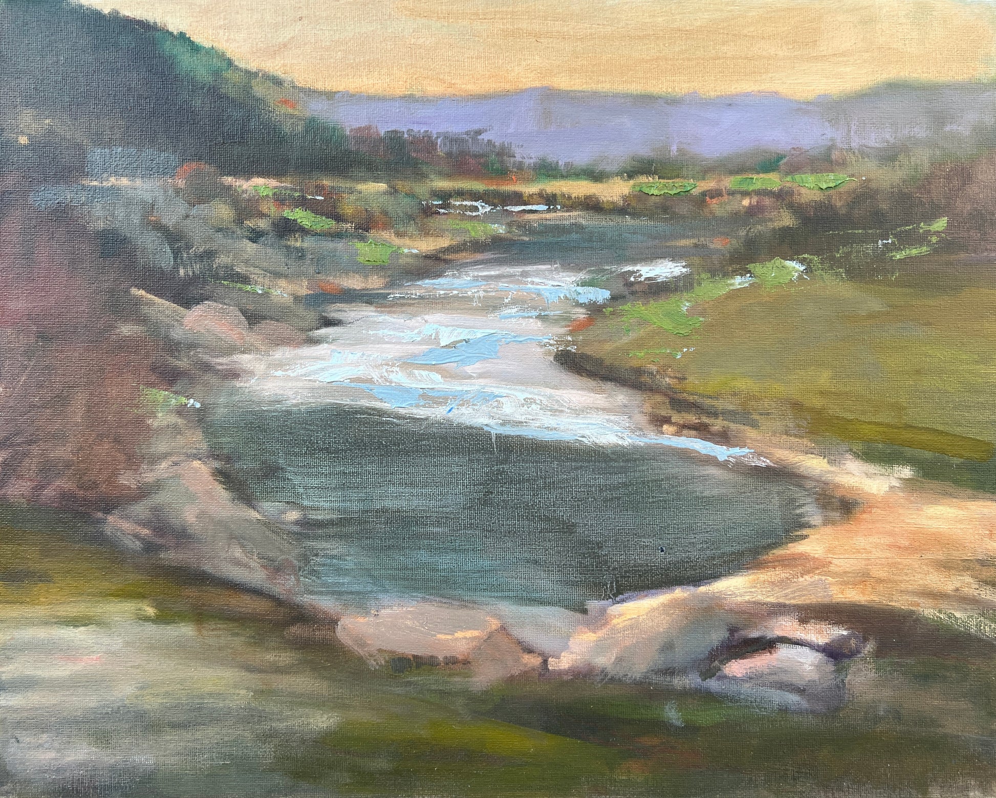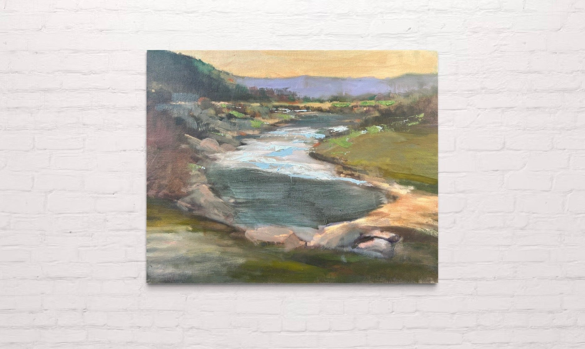 This landscape painting unfolds with a tranquil river winding through the terrain. Broad, confident brushstrokes create depth and texture in the flowing water, with soft blues and greys evoking movement and reflection. The surrounding hills and foliage are painted with a loose, atmospheric touch, blending greens, earth tones, and hints of violet for distant shadows. The warm golden sky gives the scene a quiet, late-day glow, drawing the viewer into a serene, contemplative space.