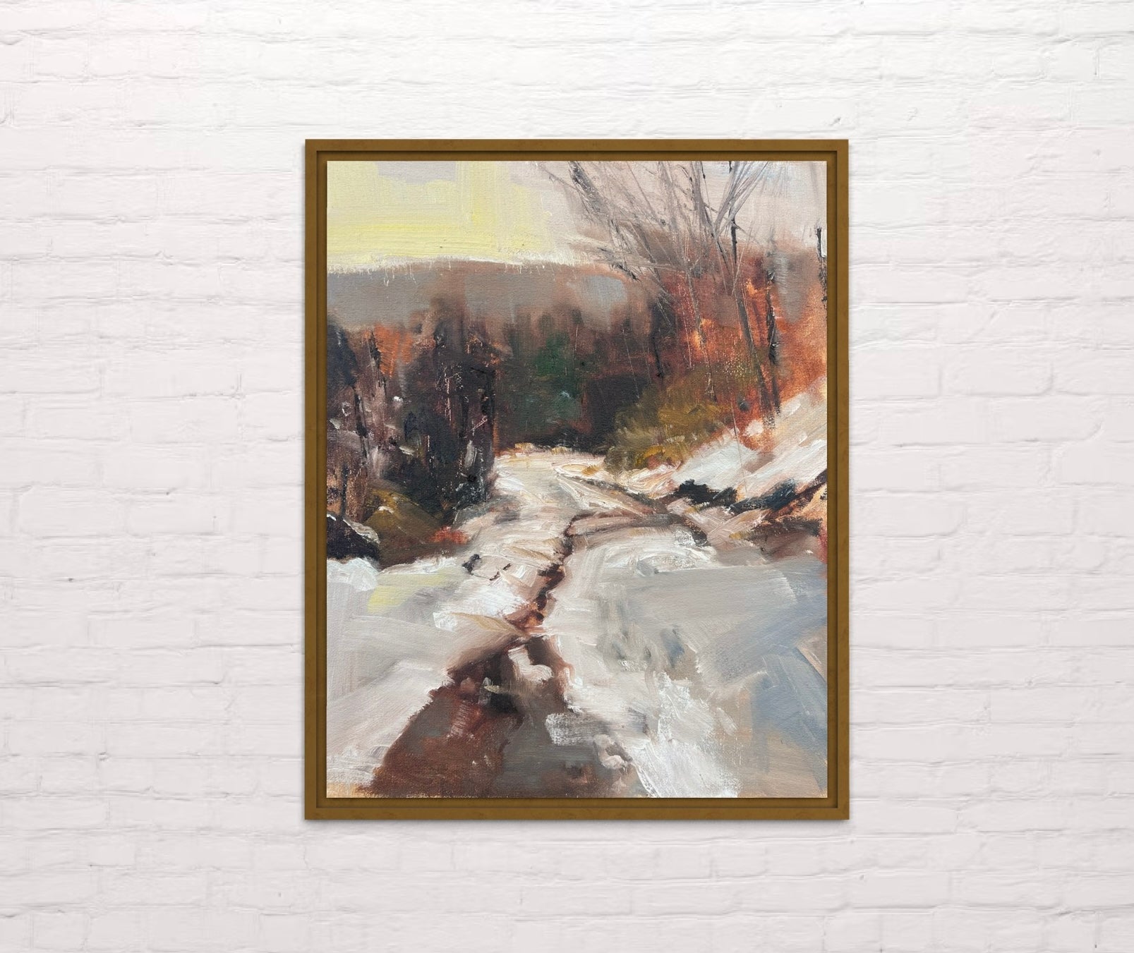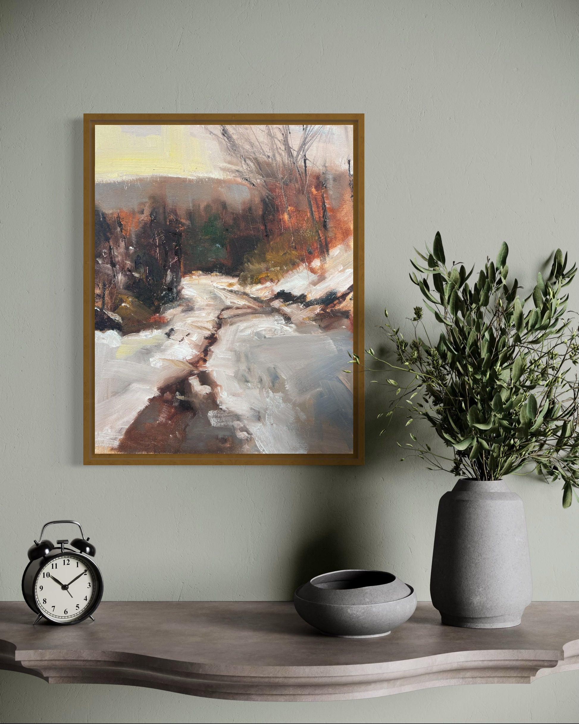 This expressive oil painting captures the raw beauty of a winter landscape with a winding, snow-covered path leading into a forest. The artist’s bold, gestural brushstrokes create a sense of movement, while the earthy tones of brown, rust, and deep green contrast beautifully against the cool whites and grays of the snow. The sky is subtly illuminated with hints of yellow, suggesting the warmth of a setting or rising sun. The interplay of light and shadow adds depth, drawing the viewer into the scene. Perfect for collectors who appreciate impressionistic winter landscapes that evoke both solitude and quiet beauty, this piece brings a sense of adventure and serenity to any space.
