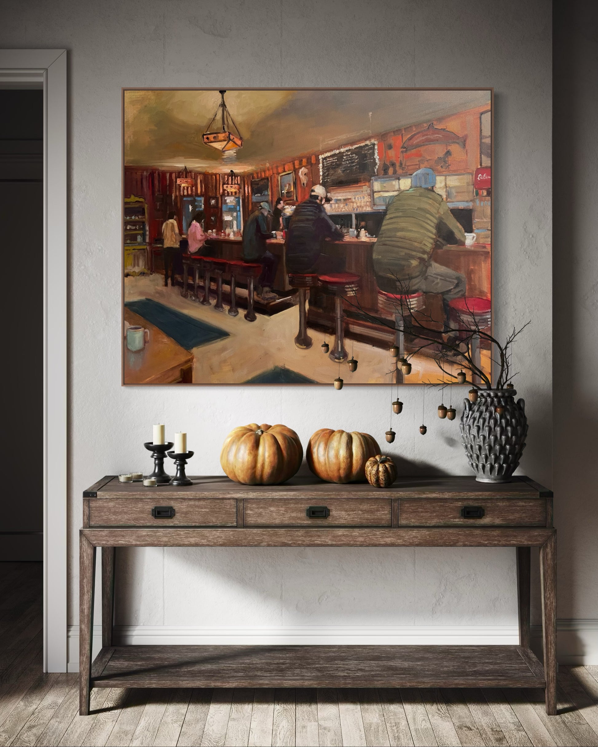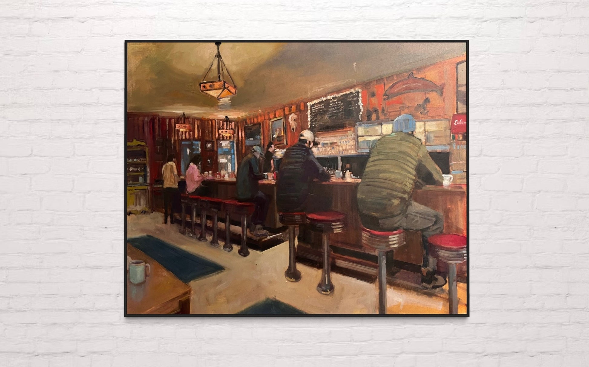 A warm and nostalgic scene of a Western diner, with patrons sitting at the counter, absorbed in quiet moments. Rich wood tones, red barstools, and soft lighting capture the timeless charm of a cozy café. A lone mug in the foreground invites the viewer into this peaceful moment.